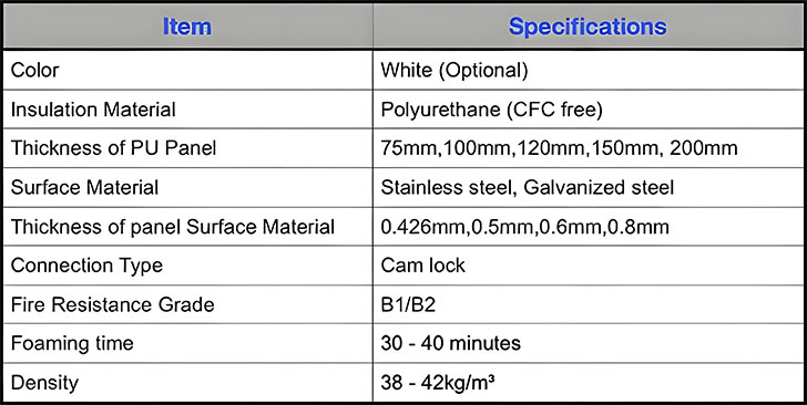 Specifications of PU Panel