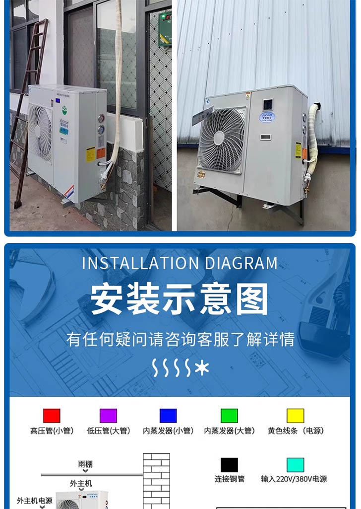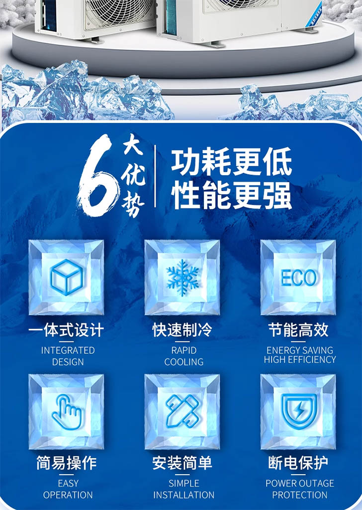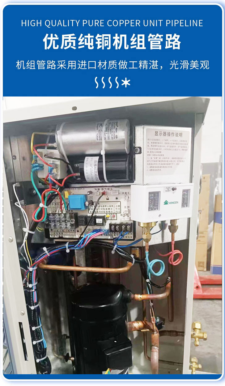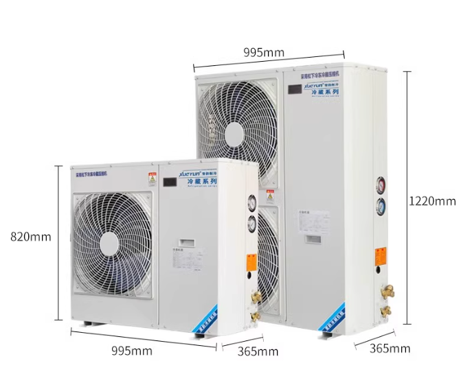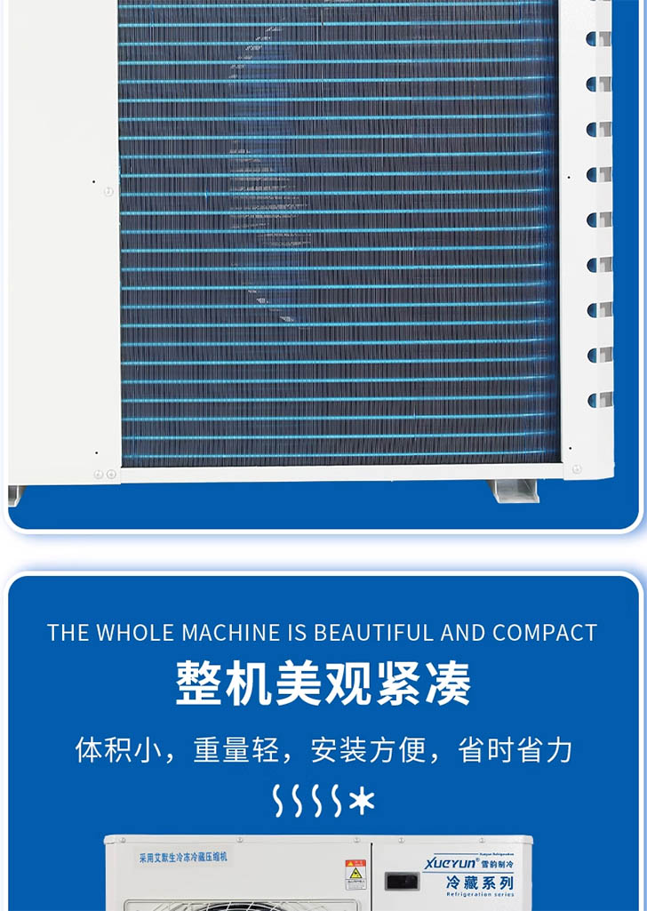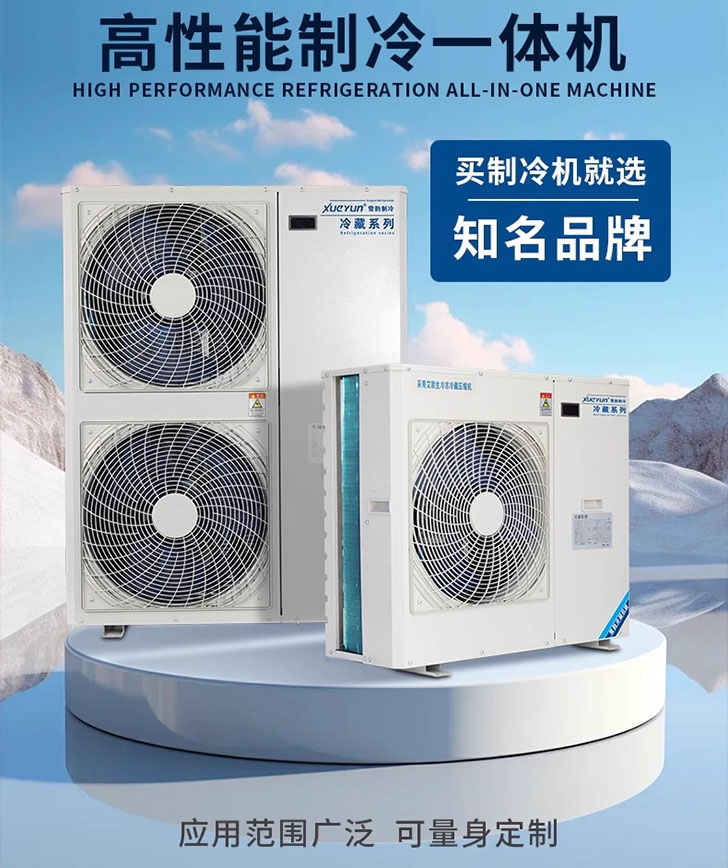 The condensing units utilize Copeland fully hermetic or semi-hermetic air-cooled scroll compressors and high-quality Chinese-branded refrigeration components (which can be replaced with Danfoss components).